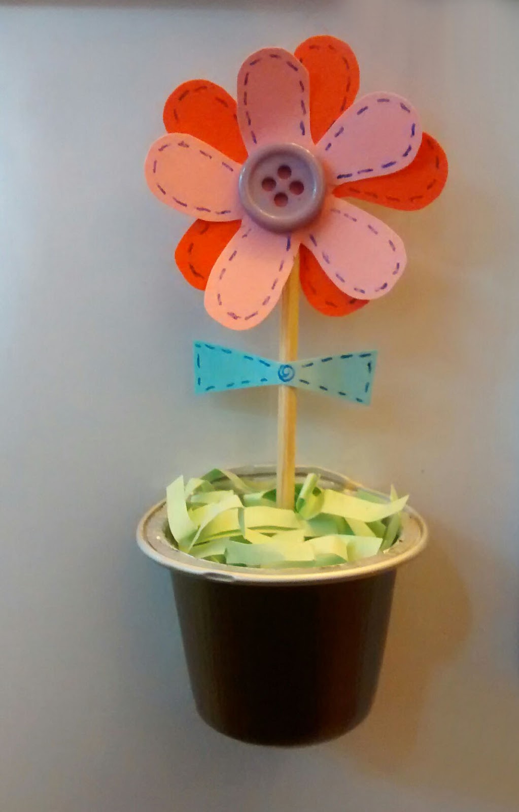 Jeje, esta es mi maceta NesT, ya sabes, porque está hecha con una cápsula. La flor es de cartulina de colores. Muy sencilla pero muy graciosa, decora mi frigorífico, ya que es un imán. 🙂
