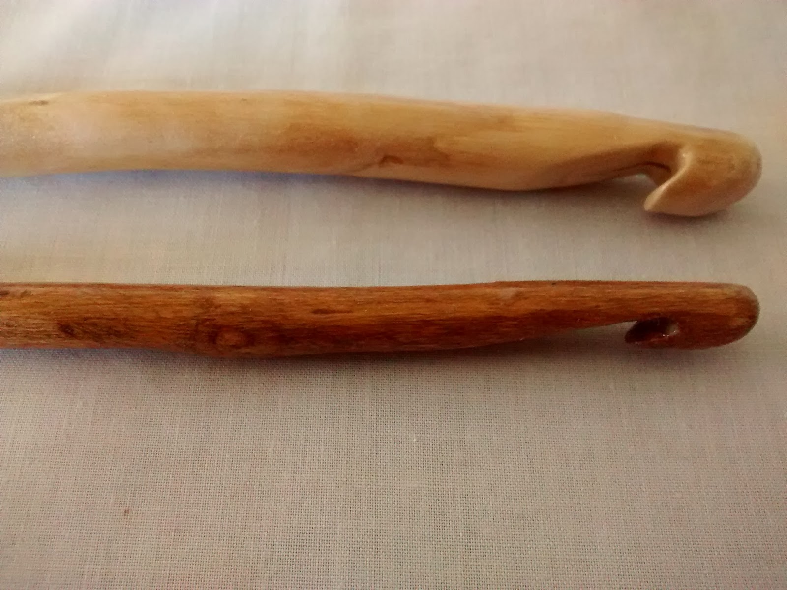 Los he “pelao”, lijao, y pulido con esmero hasta que han quedado suaves, suaves, suaves, y después con una segueta, he cortado la puntita para darle forma de gancho, y que se pareciese a un ganchillo. Luego más lija, y más pulido y una capita de barniz transparente.