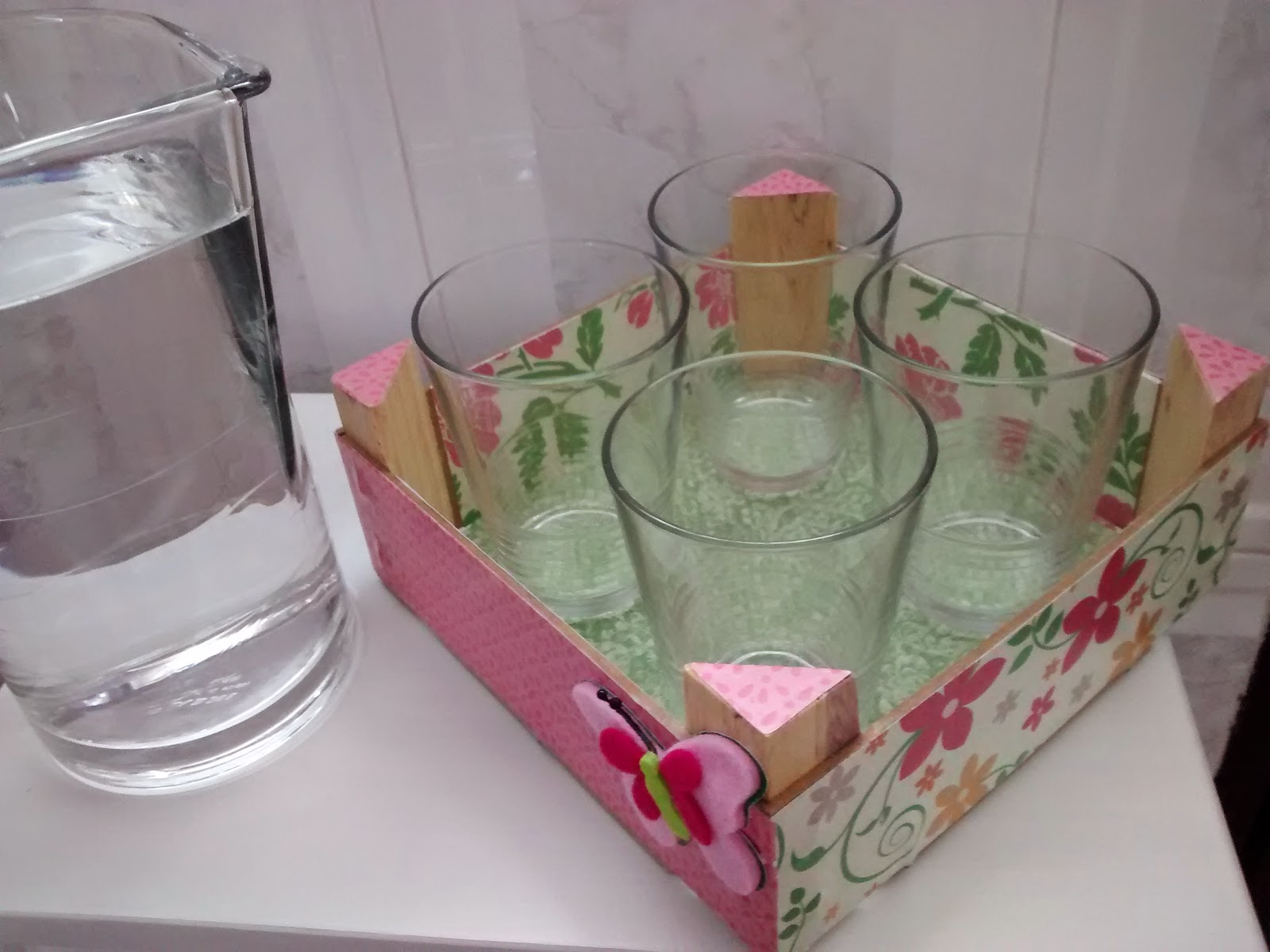 Para cuando eso ocurra, yo he preparado una bandejita para vasos, para tenerla siempre a mano, y en cualquier momento, que tengamos sed, poder beber agua, limonada o cualquier refresco facilmente. Además me lo he pasado genial haciéndola….